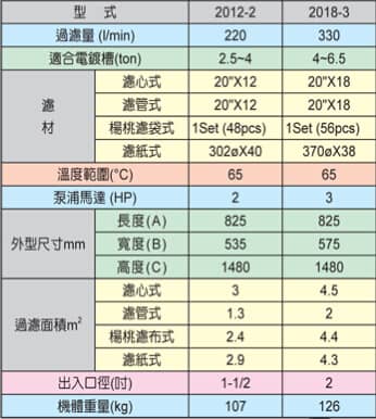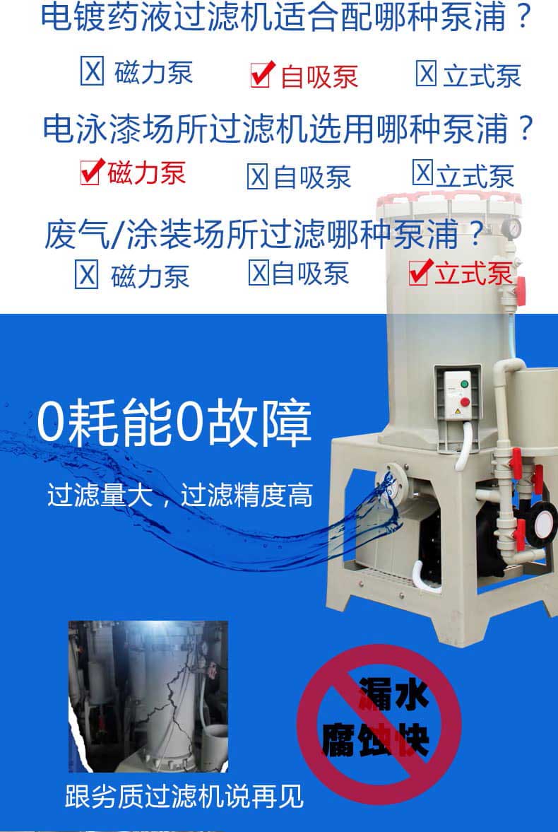 電鍍液過濾機特點: 1、過濾機主體及各重要零件,均采PP塑鋼材料一體成型開模生產(chǎn),達到焊接點少、防漏液性佳的 點,及具有耐高溫、耐酸堿等特性。 2、安 開關(guān)保護裝置,當馬達過載或單相運轉(zhuǎn)時,安 開關(guān)層自動切斷電源。 3、馬達防護罩,確保馬達在酸氣中不易受腐蝕。 4、高精制過濾、過濾面積廣、效率高、操作簡單、清洗容易。 5、可依客戶選擇不同濾材之變化,另可加裝活性碳快速攪拌循環(huán)回路處理裝置,操作簡單。 6、附底閥1個,PVC視流器1個,依客戶選擇PVC或PP法蘭1組。 7、另有鈦金屬束環(huán)組可供選擇。 電鍍液過濾機參數(shù)表: