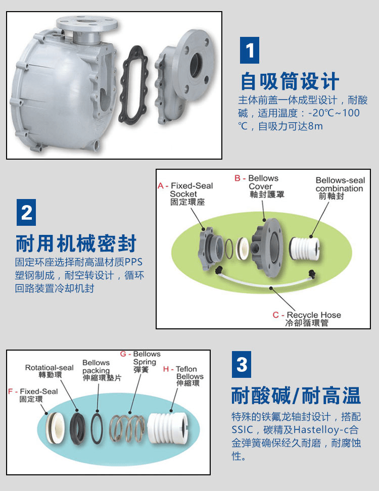 01塑料耐酸堿泵特點(diǎn)描述 .塑料耐酸堿泵適用溫度:FRPP/CFRPP-85℃以下,PVDF-90℃以下,CPVC-70℃以下,視各種化學(xué)性質(zhì)不同而定。 .機(jī)械軸封設(shè)計(jì):采用Teflon Bellows Seal自冷式設(shè)計(jì),并有 業(yè)冷卻循環(huán)回路,在空轉(zhuǎn)時(shí)會(huì)利用泵內(nèi)部的液體循環(huán)冷卻機(jī)械軸封,軸封材質(zhì):Sic,Carbon,Ceramic。 .自吸式設(shè)計(jì):自吸力特強(qiáng),自吸力可達(dá)20ft,3″機(jī)種 使用有舌單向閥規(guī)格,才有自吸能力。 .抗腐蝕性:采用FRPP塑鋼材料射出成型,有FRPP,CFRPP,CPVC,PVDF可抵抗大部份的酸堿液。 .軸封護(hù)罩設(shè)計(jì),采用可分解設(shè)計(jì)易拆卸更換,以耐高溫塑鋼制成,耐高溫120℃,不易因空轉(zhuǎn)損壞。