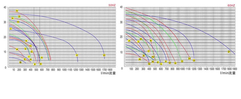 塑寶TD型耐酸堿立式泵型號性能曲線圖: